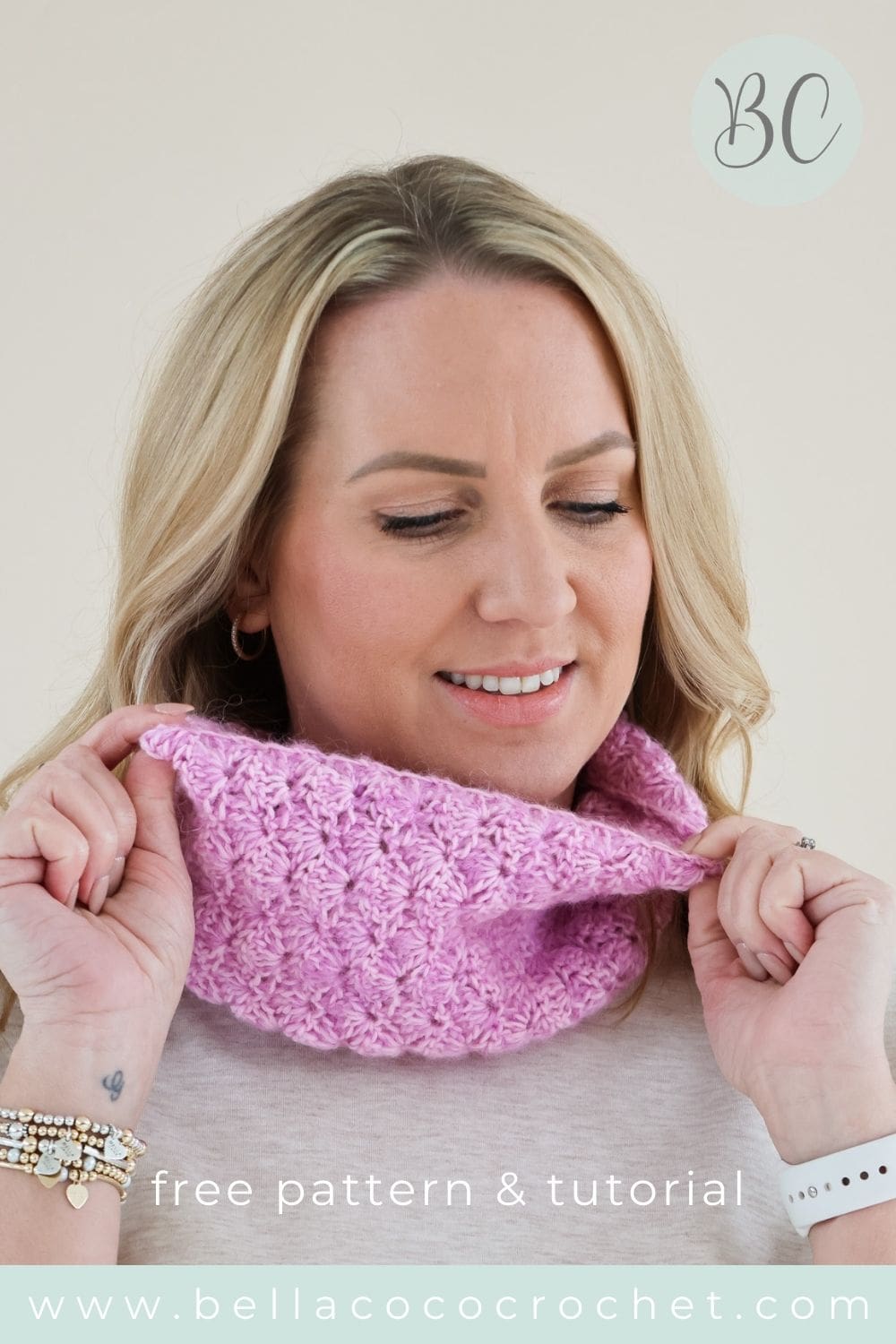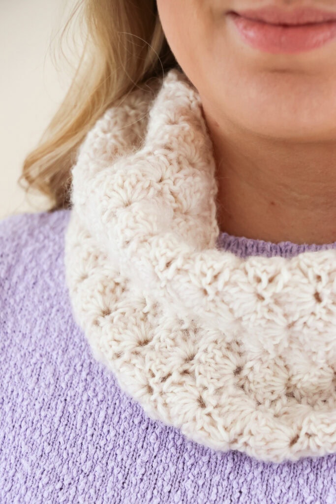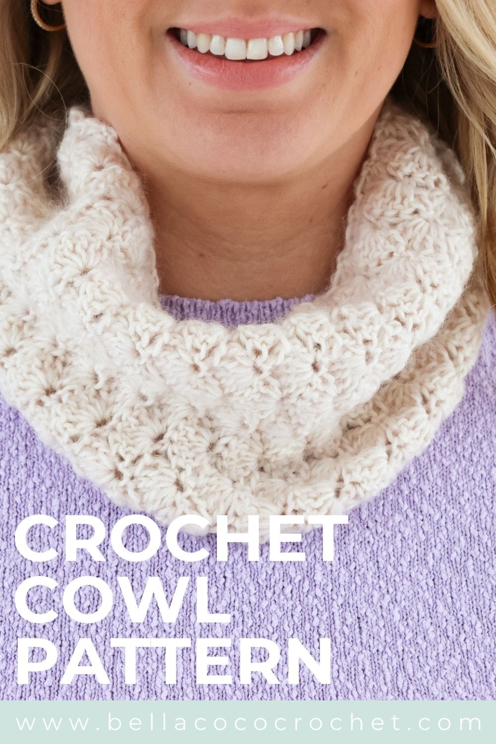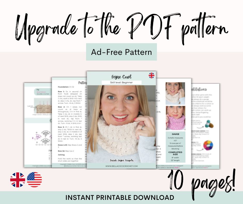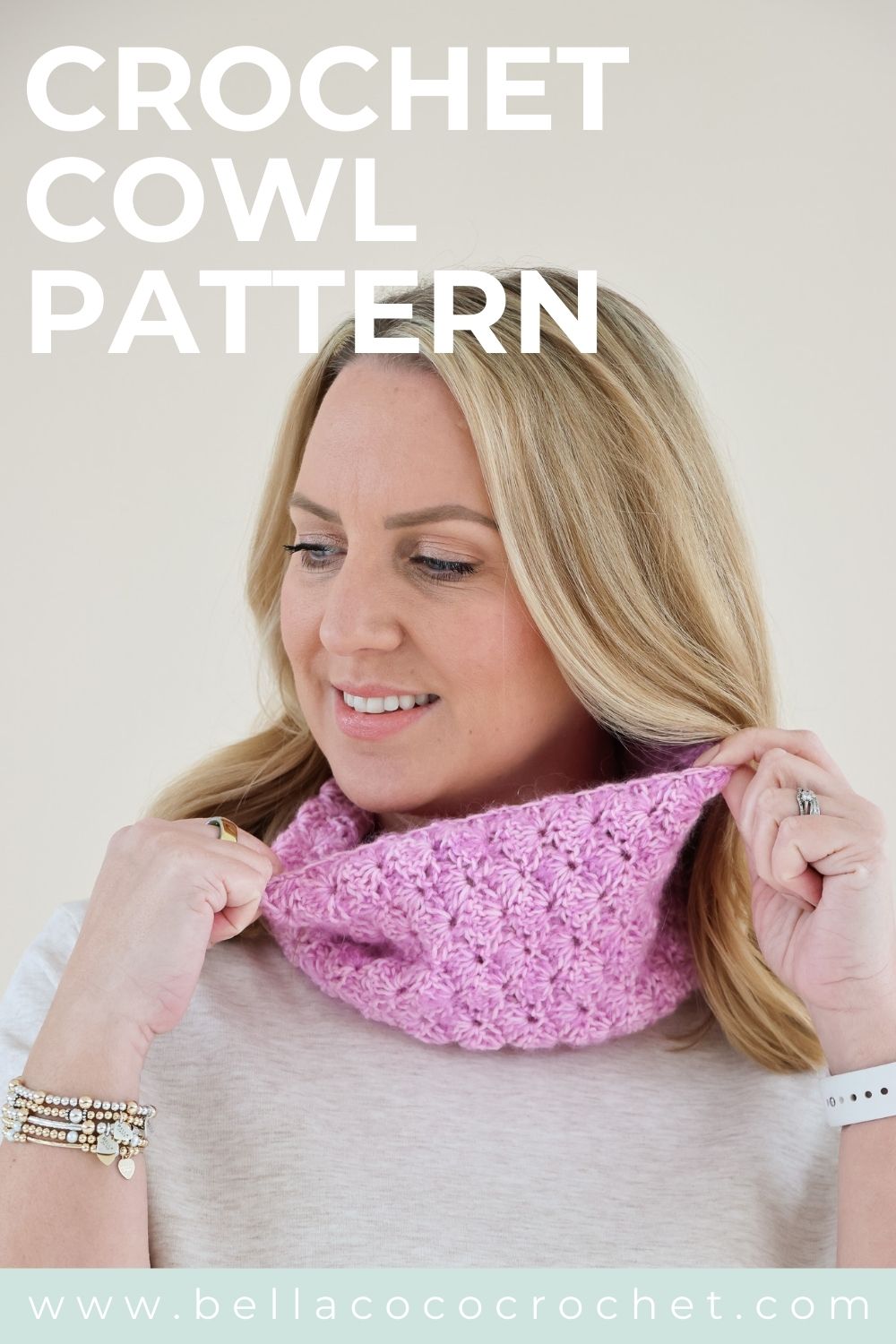 Beginners / Garments / Scarves & Cowls How to Crochet the Feyre Cowl: FREE Pattern & Tutorial Updated March 19, 2026 This post contains affiliate links. If you make a purchase through links on our site, I may earn a small commission. Click to see full details of my Privacy Policy. Pin it now, make later!40Shares How to crochet the Feyre Cowl with my free step-by-step pattern and video tutorial to guide you every step of the way.TABLE OF CONTENTS1. Materials & Tools2. About The Yarn: Bella Coco Merino 3. Where To Buy Yarn4. PDF Pattern5. Pattern Notes6. Gauge7. Completed Size8. Pin For Later9. Pattern Support10. Convert Pattern Terms11. Terms & Abbreviations12. Special stitches13. Feyre Cowl: Free Crochet Pattern14. Joining15. Video Tutorials 16. Right-handed17. Left-handed18. Explore More Crochet Cowl Patterns VIEW MORE▼ Crochet cowls are one of those projects that tick all the boxes, they’re stylish, practical, and wonderfully relaxing to make. Whether you’re looking for a cosy layer to keep the chill away or a handmade accessory that adds texture and personality to your wardrobe, a crochet cowl is always a great choice. In this post, I’m sharing a cowl design that’s perfect for mindful stitching, beautiful drape, and everyday wear, ideal for curling up with your favourite yarn and hook; introducing the Feyre Cowl. Materials & Tools Yarn A: Bella Coco Merino, 100% Merino Wool, Sport (#2), 50g (1.75oz), 165m (180yds), 180yds of shade 03 Cream. Yarn B: Hobbii Diablo, 40% Acrylic, 30% Mohair, 30% Polyamide, Lace (#0), 25g (0.9), 225m (246yds), 207yds of shade 10 Oyster. Hook: 5mm (US H-8) Scissors Darning Needle Measuring Tape About The Yarn: Bella Coco Merino Bella Coco Merino is an exclusive 100% merino wool yarn created in collaboration with Hobbii. Bella Coco Merino comes in a carefully curated colour palette reflecting my creative journey. From delicate pastels and muted shades to bright middle tones and vivid colours. shop the yarn here Where To Buy Yarn Wool Warehouse we crochet Mary maxium love crafts Herrschners PDF Pattern etsy bella coco crochet ravelry Pattern Notes This pattern is written in UK terms but switchable to US terms below. Skill Level: Beginner Pattern is worked holding the two strands of yarn together. It is made in a flat oblong before joining the foundation row andfinal row to form a circle. Light Blocking might be required once joined. Gauge 3 shells measures 4.5″9 rows per 4″measured before blocking Completed Size 8″ width22″ length Pin For Later Pattern Support The fastest way to get pattern support is to ask in our dedicated facebook group for Bella Coco Crochet patterns. This is the best place for you to connect with other crocheters. Please note, if you wish to change and adapt this pattern in any way, this must be done at your own exploration and we cannot offer assistance with this. Convert Pattern Terms Here you can quickly switch between UK and US crochet terms. This will make following the pattern easier as all terms will be converted to your preferred version. view in UK terms view in US terms Terms & Abbreviations Stitch(s): st(s) Slip Stitch(s): ss(s): Insert hook, yarn over, pull through stitch and loop on hook. Chain(s): ch(s): Yarn over, pull through loop on the hook. Repeat: rep: Double Crochet(s): dc(s): Insert hook into stitch, yarn over, pull up a loop, you will have two loops on the hook. Yarn over, pull through remaining two loops. Treble Crochet(s): tr(s): Yarn over, insert into stitch, yarn over, pull up a loop, you will have three loops on the hook. Yarn over, pull through two loops, yarn over, pull through remaining two loops. Special stitches Shell Stitch (ShSt): Work 5 tr into indicated stitch. Stitch counts are shown at the end of a row in angle brackets <> and are only provided when the stitch count changes. How to Crochet – A Handy Reference Guide eBook Unsure of the differences between UK and US terms? Need a refresher on how to do your crochet stitches? In my ‘How to crochet: A handy reference guide’ EBook I help you with all of these terms and you can always have them to hand! You will also get exclusive access to free video instructions. You can find my EBook HERE. Feyre Cowl: Free Crochet Pattern You are viewing this pattern in UK terms. Foundation: Ch 32 Row 1: Dc in second ch from hook (skipped ch does not count as st), *skip 2 chs, work a ShSt into next st, skip 2 chs, dc; rep from * across. Turn. <6 dc, 5 ShSt> Row 2: Ch 1 (does not count as st here or throughout), 3 tr in first st, *skip 2 sts, dc in middle tr of next ShSt, skip 2 sts, ShSt in next dc; rep from * across, working 3 tr in last dc. Turn. <5 dc, 4 ShSt, 6 tr> Row 3: Ch 1, dc in first st, skip 2 sts, *ShSt in next dc, skip 2 sts, dc in middle tr of next ShSt, skip 2 sts; rep from * across, working last dc in last st. Turn. <6 dc, 5 ShSt> Rows 4-51: Rep Rows 2 and 3 Row 52: Rep row 2 Joining For this section of the pattern, when working into the ‘dc and ShSt’ you will be working into the underside of that stitch. The underside of the ShSt is the st that all of the trs are worked into. Working through both thicknesses, insert hook into the final row and the foundation chain, ss into the first st and first dc of foundation, (ss in next st and ch-sp of foundation) twice. *Ss in next st and ShSt of foundation, (ss in next st and ch-sp of foundation) twice. Ss in next st and dc of foundation, (ss in next st and ch-sp of foundation) twice; rep from * three more times. Ss in next st and ShSt of foundation, (ss in next st and ch-sp of foundation) twice. Ss in last dc. Fasten off and sew in ends. Light blocking may be required. Video Tutorials Right-handed Or you can watch on YouTube Left-handed Or you can watch on YouTube Explore More Crochet Cowl Patterns Verity Infinity Scarf Houndstooth Cowl Dahlia Infinity Scarf Verity Infinity Scarf Houndstooth Cowl Dahlia Infiniy Scarf I always love to see your makes so if you try any of my patterns or