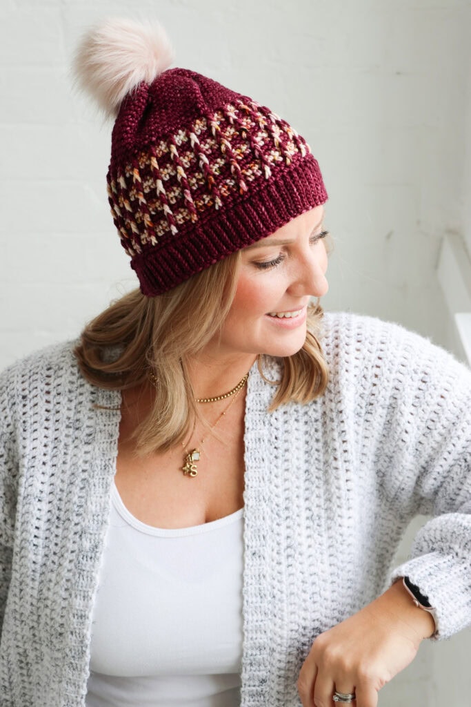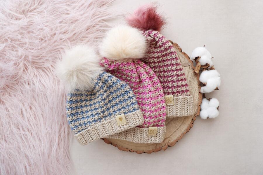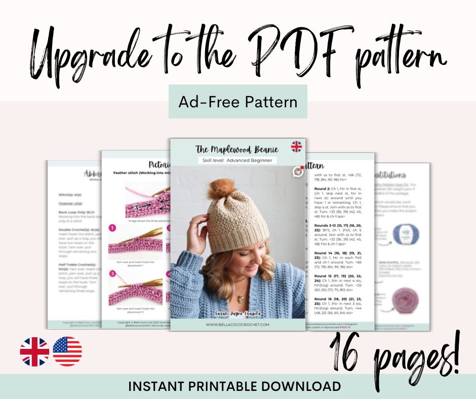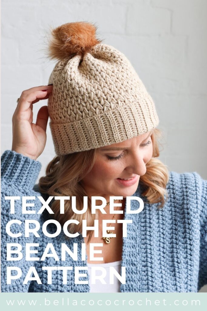 Accessories / Garments / Hats & Earwarmers Textured Crochet Beanie – Free Pattern & Step-by-Step Video Tutorial Updated February 18, 2026 This post contains affiliate links. If you make a purchase through links on our site, I may earn a small commission. Click to see full details of my Privacy Policy. Pin it now, make later!55Shares Learn how to crochet a textured crochet beanie with this free step-by-step pattern and video tutorial in right and left-handed. If you’re looking for a cosy, textured project that works up beautifully, the Maplewood Beanie is the perfect make for your next hook-and-yarn session. This stitch creates a soft, sweeping texture reminiscent of feathers, both elegant and wonderfully squishy! The maplewood beanie is part of a series of patterns that I’ll also share in this post. TABLE OF CONTENTS1. Materials & Tools 2. About the Yarn3. Where to Shop Yarn4. Pattern Notes 5. Gauge6. Completed Size7. Yarn Quantities8. Pattern Support9. Convert Pattern Terms10. Terms & Abbrevations 11. Special Stitches12. PDF Pattern13. Pin For Later 14. Free Pattern: Maplewood Beanie15. Brim16. Main Hat Section17. Baby, toddler, child ONLY18. Teen ONLY19. Adult, adult large ONLY20. All Sizes21. Styling22. Video Tutorials 23. Right-handed 24. Left-handed25. Maplewood Collection 26. Explore More Beanie Patterns VIEW MORE▼ Materials & Tools Yarn: Yarnsmiths Pebble Haze DK (#3), 33% acrylic, 67% Cotton, 50g (1.75oz), 145m (159yds) in shade Pumice 2C060. Hook: 4mm (US G-6) Darning Needle Scissors Stitch Markers x2 (Optional) Pom pom About the Yarn Yarnsmiths Pebble Haze DK is part of the ever-growing Yarnsmiths family. This DK is a soft and beautiful yarn, in a range of stunning shades inspired by nature’s beaches, pebbles and stones! It’s perfect for all crocheted projects, including jumpers, cardigans, children’s wear, homeware, and accessories. I’ll share some of my favourite shades below. Pumice Syenite Pink Smithsonite Petalite Where to Shop Yarn Wool Warehouse we crochet Mary maxium love crafts Herrschners Pattern Notes This pattern is written in UK terms but is switchable to US terms above.Pattern is written in six sizes: baby (toddler, child) (tween, adult, adult large). The beanie is worked from the bottom upwards creating the brim first.Please read through the whole pattern prior to starting. Gauge 9 sts and 14 rows measured over 10 cm (4 inch) measured over feather stitches. Completed Size Area/Approx.MeasurementBabyToddlerChildTweenAdultAdultLargeCircumference37 cm(14.5 in)40.5 cm(16 in)44.5 cm(17.5 in)48 cm(19 in)51 cm(20 in)53.5 cm(21 in)Height (whenband folded)15.25 cm(6 in)17.75 cm(7 in)19 cm(7.5 in)20.25 cm(8 in)22.75 cm(9 in)24 cm(9.5 in) Yarn Quantities YardageBabyToddlerChildTweenAdultAdultLarge217 yds274 yds328 yds472 yds490 yds525 ydsYardage is approximate. Pattern Support The fastest way to get pattern support is to ask in our dedicated facebook group for Bella Coco Crochet patterns. This is the best place for you to connect with other crocheters. Please note, if you wish to change and adapt this pattern in any way, this must be done at your own exploration and we cannot offer assistance with this. Convert Pattern Terms Here you can quickly switch between UK and US crochet terms. This will make following the pattern easier as all terms will be converted to your preferred version. view in UK terms view in US terms Terms & Abbrevations Stitch(s): st(s) Slip Stitch(s): ss(s): Insert hook, yarn over, pull through stitch and loop on hook. Chain(s): ch(s): Yarn over, pull through loop on the hook. Double Crochet(s): dc(s): Insert hook into stitch, yarn over, pull up a loop, you will have two loops on the hook. Yarn over, pull through remaining two loops. Half Treble Crochet(s):htr(s):Yarn over, insert into stitch, yarn over, pull up a loop, you will have three loops on the hook. Yarn over, pull through remaining three loops. Half Treble Crochet 2 together(s): htr2tog(s): Yarn over, insert into next stitch, yarn over, pull up a loop) twice. You will have five loops on the hook. Yarn over, pull through all five loops. Back Loop Only: BLO: Working into the back loop only of a stitch. Special Stitches Beginning Feather Stitch (BFS) Yarn over, insert hook into first ch-sp, yarn over, pull up a loop in line with loops on the hook (3 loops on hook), yarn over, insert hook into ch-1 sp or skipped st two rows below, yarn over, pull up a loop in line with loops on the hook (5 loops on hook), yarn over, insert hook in next ch-1 sp, yarn over and pull up a loop in line with loops on the hook, yarn over and pull through all 7 loops on the hook. Feather Stitch (FeS) Yarn over, insert hook into same ch-1 sp as last part of previous BFS or FeS, yarn over and pull up a loop in line with loops on the hook (3 loops on hook), yarn over, insert hook into ch-1 sp or skipped st two rows below, yarn over and pull up a loop in line with loops on the hook (5 loops on hook), yarn over, insert hook in next ch-1 sp, yarn over and pull up a loop in line with loops on the hook, yarn over and pull through all 7 loops on the hook. How to Crochet – A Handy Reference Guide eBook Unsure of the differences between UK and US terms? Need a refresher on how to do your crochet stitches? In my ‘How to crochet: A handy reference guide’ EBook I help you with all of these terms and you can always have them to hand! You will also get exclusive access to free video instructions. You can find my EBook HERE. PDF Pattern etsy bella coco crochet ravelry Pin For Later Free Pattern: Maplewood Beanie You are viewing this pattern in UK terms. Brim Foundation: Ch 19 (21, 22) (23, 25, 26) Row 1: Htr in second ch from hook (missed ch does not count) and across. Turn. <18 (20, 21) (22, 24, 25) sts> Row 2-44 (48, 52) (56, 60, 64): Ch 1 (does not count a st here and throughout) BLOhtr in each st across. Turn. Fold work to have short ends together. Chain 1, ss through BLO of each stitch of final row and the corres