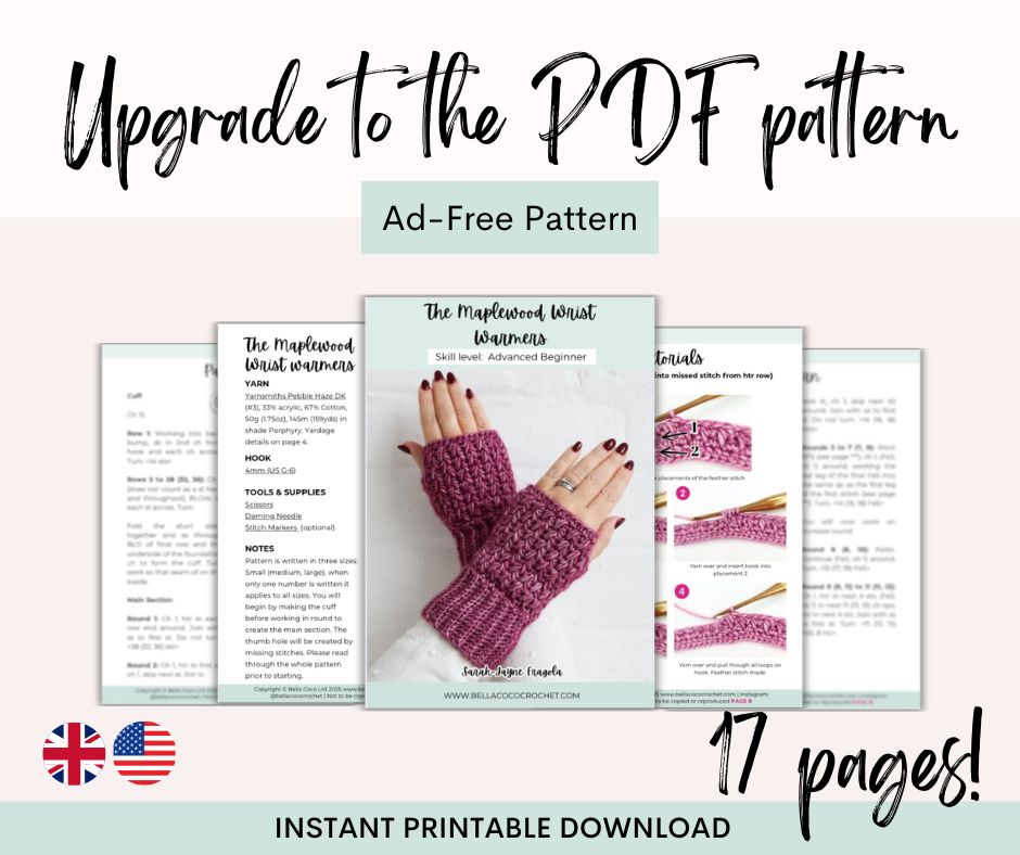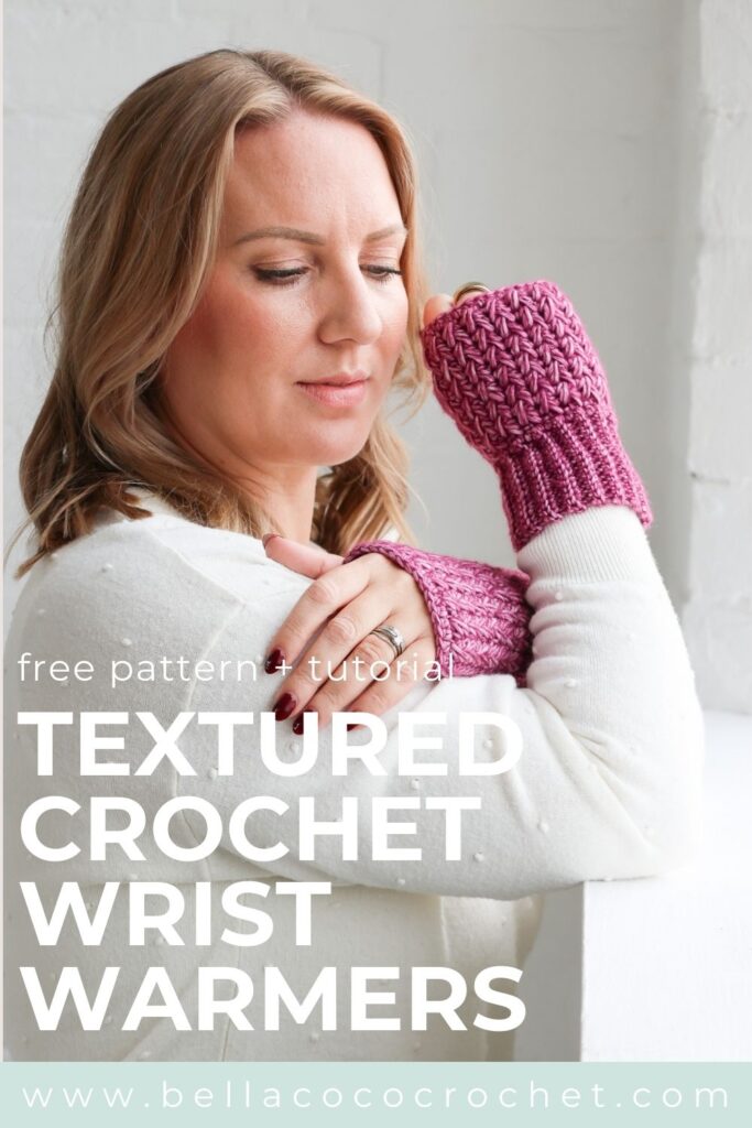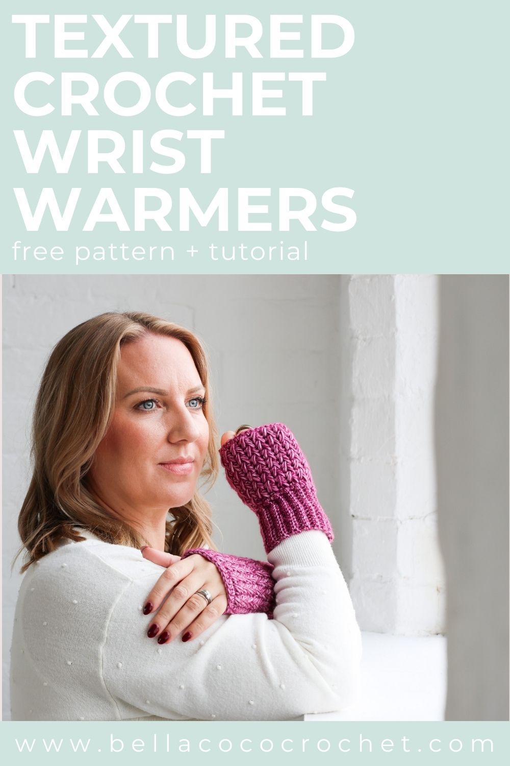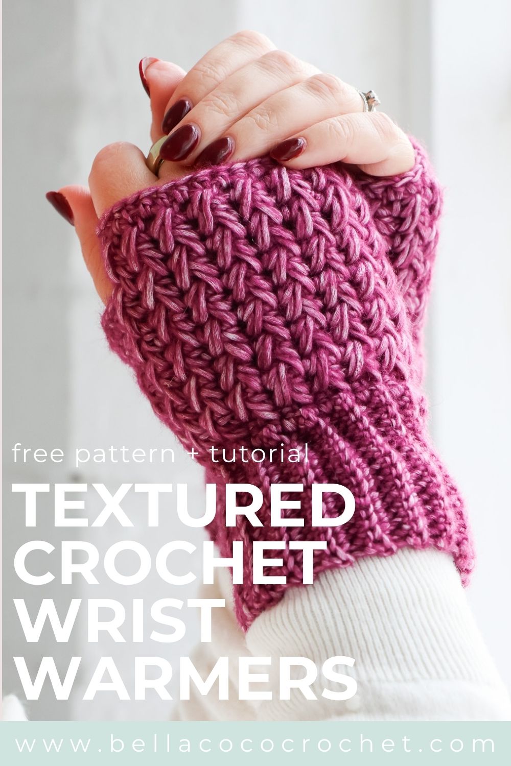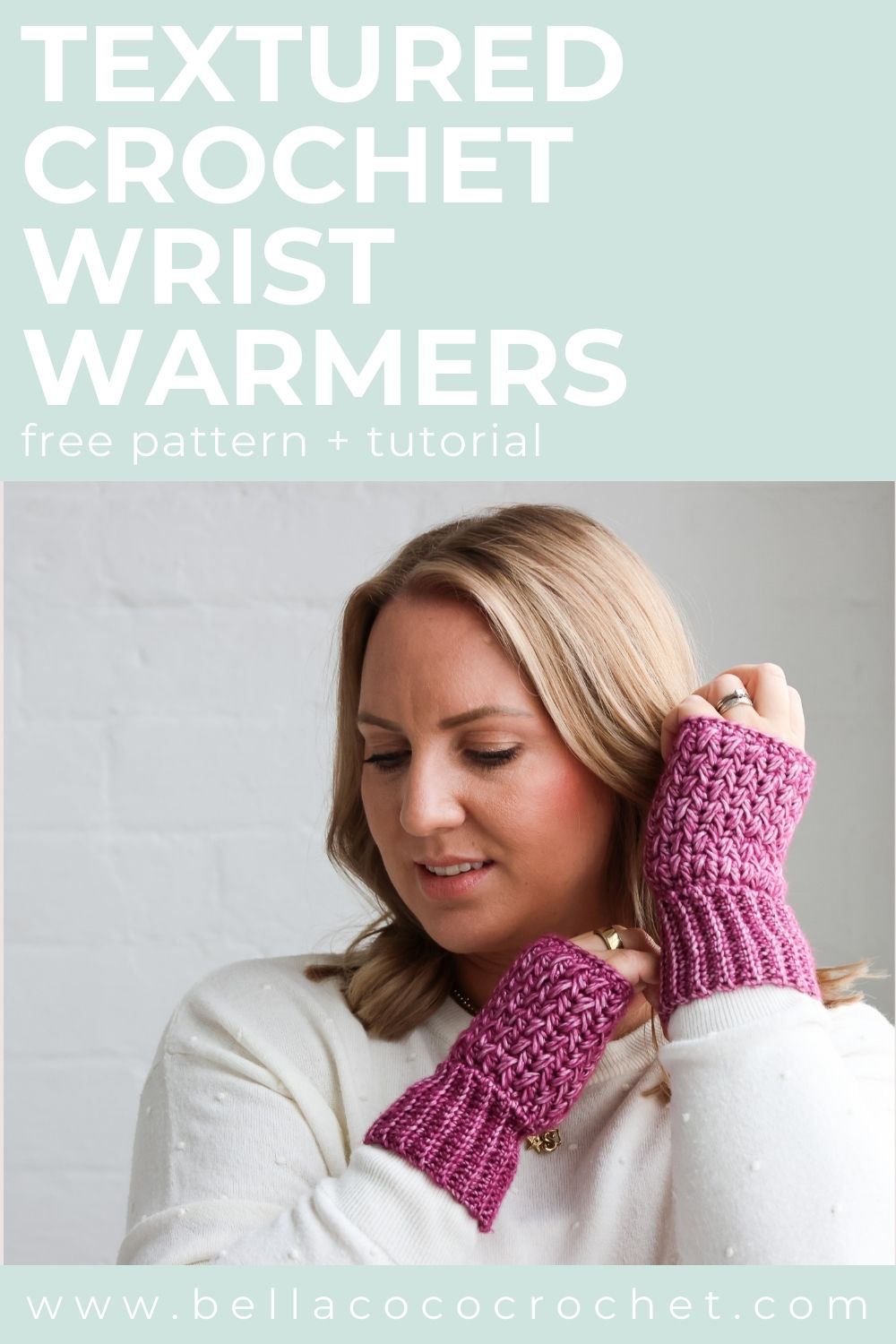 Garments / Mittens & Wrist Warmers Textured Crochet Wrist Warmers – Free Pattern & Video Tutorial Updated January 2, 2026 This post contains affiliate links. If you make a purchase through links on our site, I may earn a small commission. Click to see full details of my Privacy Policy. Pin it now, make later!1.6KShares Learn how to crochet these textured crochet wrist warmers with this free step-by-step pattern and video tutorial. During the cooler seasons, there’s nothing quite like a quick, stylish accessory project to warm up your hook. The Maplewood Wrist warmers are perfect for a confident beginner ready to explore new textures or a seasoned crocheter looking for a quick win, these wrist warmers are the perfect project.TABLE OF CONTENTS1. Why You’ll Love This Pattern2. Materials & Tools 3. About the Yarn4. Where to Shop Yarn5. Convert Pattern Terms6. Terms & Abbreviations 7. Special Stitches8. Beginning Feather Stitch (BFS):9. Feather Stitch (FeS):10. Feather Stitch (FeSin):11. Pattern Notes 12. Gauge13. Size and Yarn Quantities14. Pattern Support15. PDF Pattern16. Pin For Later17. Free Pattern: Maplewood Wrist Warmers 18. Main Section19. Thumb Opening20. Large ONLY21. All Sizes22. Video Tutorials23. Right-handed24. Left-handed 25. Patterns to Try NextVIEW MORE▼ Why You’ll Love This Pattern Quick to make: these are achiveable to make over a weekend or quicker depending how quickly you crochet. Beautifully textured: looks intricate but uses simple stitches that create this beautiful, feathered surface texture. Beginner-friendly: the step-by-step pattern and video tutorial makes it accessible to all levels! Materials & Tools Yarn: Yarnsmiths Pebble Haze DK (#3), 33% acrylic, 67% Cotton, 50g (1.75oz), 145m (159yds) Shades used in samples: Porphyry Hook: 4mm (US G-6) Darning Needle Scissors Stitch Markers (Optional) About the Yarn Yarnsmiths Pebble Haze DK is part of the ever-growing Yarnsmiths family. This DK is a soft and beautiful yarn, in a range of stunning shades inspired by nature’s beaches, pebbles and stones! It’s perfect for all crocheted projects, including jumpers, cardigans, children’s wear, homeware, and accessories. I’ll share some of my favourite shades below. Ludlamite Fluorite Pink Tourmaline Coral Where to Shop Yarn Wool Warehouse we crochet Mary maxium love crafts Herrschners Convert Pattern Terms Here you can quickly switch between UK and US crochet terms. This will make following the pattern easier as all terms will be converted to your preferred version. view in UK terms view in US terms Terms & Abbreviations Stitch(s): st(s) Slip Stitch(s): ss(s): Insert hook, yarn over, pull through stitch and loop on hook. Chain(s): ch(s): Yarn over, pull through loop on the hook. Double Crochet(s): dc(s): Insert hook into stitch, yarn over, pull up a loop, you will have two loops on the hook. Yarn over, pull through remaining two loops. Half Treble Crochet(s):htr(s):Yarn over, insert into stitch, yarn over, pull up a loop, you will have three loops on the hook. Yarn over, pull through remaining three loops. Back Loop Only: BLO: Working into the back loop only of a stitch. Special Stitches Beginning Feather Stitch (BFS): Yarn over, insert hook into first ch-sp, yarn over, pull up a loop in line with loops on the hook (3 loops on hook), yarn over, insert hook into ch-1 sp or skipped st two rows below, yarn over, pull up a loop in line with loops on the hook (5 loops on hook), yarn over, insert hook in next ch-1 sp, yarn over and pull up a loop in line with loops on the hook, yarn over and pull through all 7 loops on the hook. Feather Stitch (FeS): Yarn over, insert hook into same ch-1 sp as last part of previous BFS or FeS, yarn over and pull up a loop in line with loops on the hook (3 loops on hook), yarn over, insert hook into ch-1 sp or skipped st two rows below, yarn over and pull up a loop in line with loops on the hook (5 loops on hook), yarn over, insert hook in next ch-1 sp, yarn over and pull up a loop in line with loops on the hook, yarn over and pull through all 7 loops on the hook. Feather Stitch (FeSin): Yarn over, insert hook into same ch-1 sp as last part of previous BFS or FeS, yarn over and pull up a loop in line with loops on the hook (3 loops on hook), yarn over, insert hook into ch-1 sp or skipped st two rows below, yarn over and pull up a loop in line with loops on the hook, ch 1. The next feather stitch will then be worked into the same two spaces of this stitch. How to Crochet – A Handy Reference Guide eBook Unsure of the differences between UK and US terms? Need a refresher on how to do your crochet stitches? In my ‘How to crochet: A handy reference guide’ EBook I help you with all of these terms and you can always have them to hand! You will also get exclusive access to free video instructions. You can find my EBook HERE. Pattern Notes This pattern is written in UK terms but is switchable to US terms above.Pattern is written in three sizes: Small (medium, large). You will begin by making the cuff before working in round to create the main section. The thumb hole will be created by missing stitches. Please read through the whole pattern prior to starting. Gauge 8 sts measured over 10 cm (4 inch) and 6 rows per 5cm (2 inch) measured over feather stitches. Size and Yarn Quantities The pattern is written as: Small (Medium, Large)Yardage is approximate. Area/ Approx.MeasurementSmallMediumLargeCircumference (atwidest part)15.25 cm(6 in)17.75 cm(7 in)20.25 cm(8 in)Height (inc ribbing)17.75 cm(7 in)17.75 cm(7 in)20.25 cm(8 in)Yardage per pair148yds170yds206yds Pattern Support The fastest way to get pattern support is to ask in our dedicated facebook group for Bella Coco Crochet patterns. This is the best place for you to connect with other crocheters. Please note, if you wish to change and adapt this pattern in any way, this must be done at your own exploration and we cannot offer assistance with this. PDF Pattern etsy bella coco crochet 